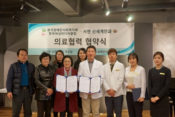 신세계안과와한국장애인사회복지회, 한국여성미디어클럽이 15년 12월31일 의료 협약식을 진행하였습니다.